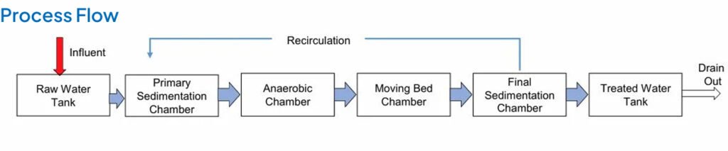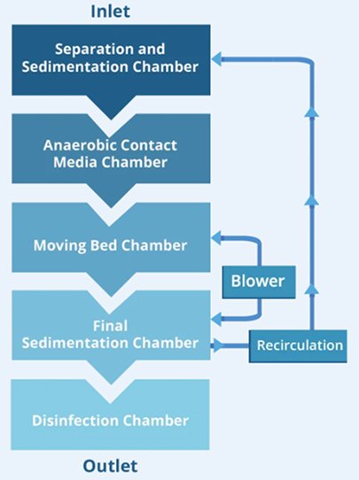 - Moving Bed Chamber: It is filled with mesh cylindrical media, which retain aerobic microorganisms to decompose and remove organic matter from wastewater.