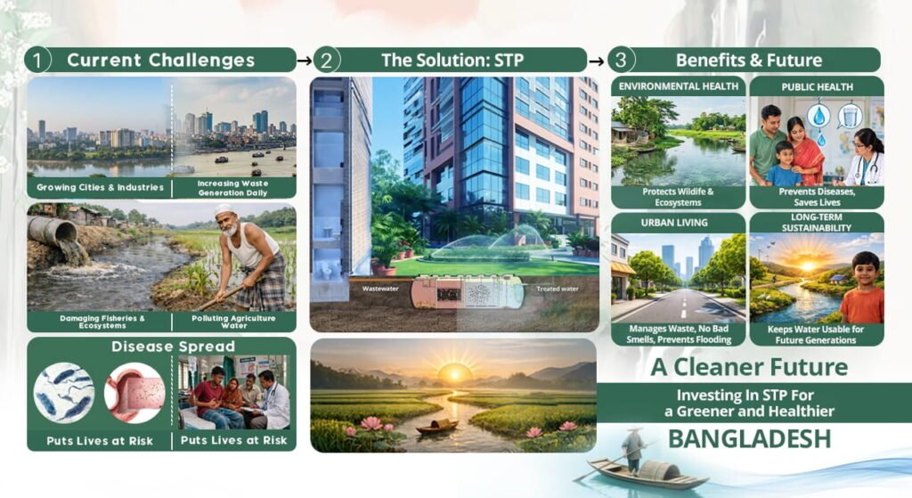 Sewage Treatment Plants (STP) are very important for Bangladesh to keep the environment clean and safe. With more people and industries growing every day, untreated sewage is causing serious problems. Dirty water from homes and factories often goes into rivers and ponds, making them unsafe for drinking, farming, or fishing. This pollution also harms fish and plants.