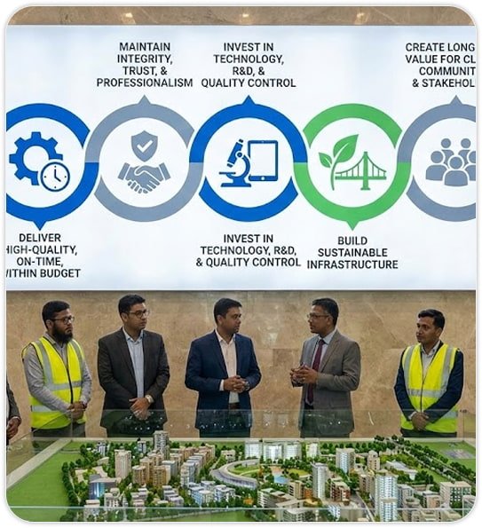 To attain a leadership position in providing quality concrete and construction solutions, delivered on time while creating customer delight and contributing to Bangladeshâs socio-economic development.